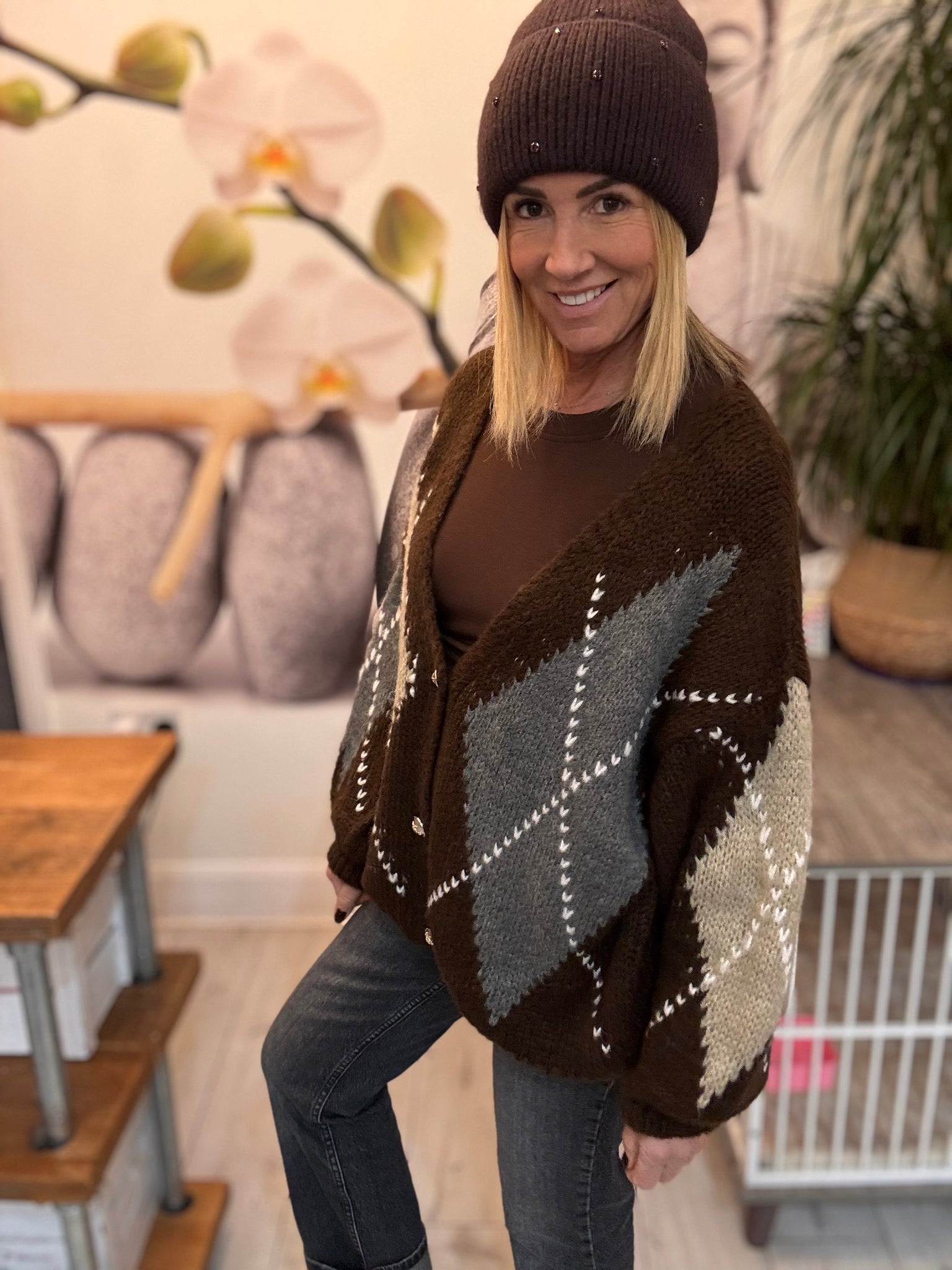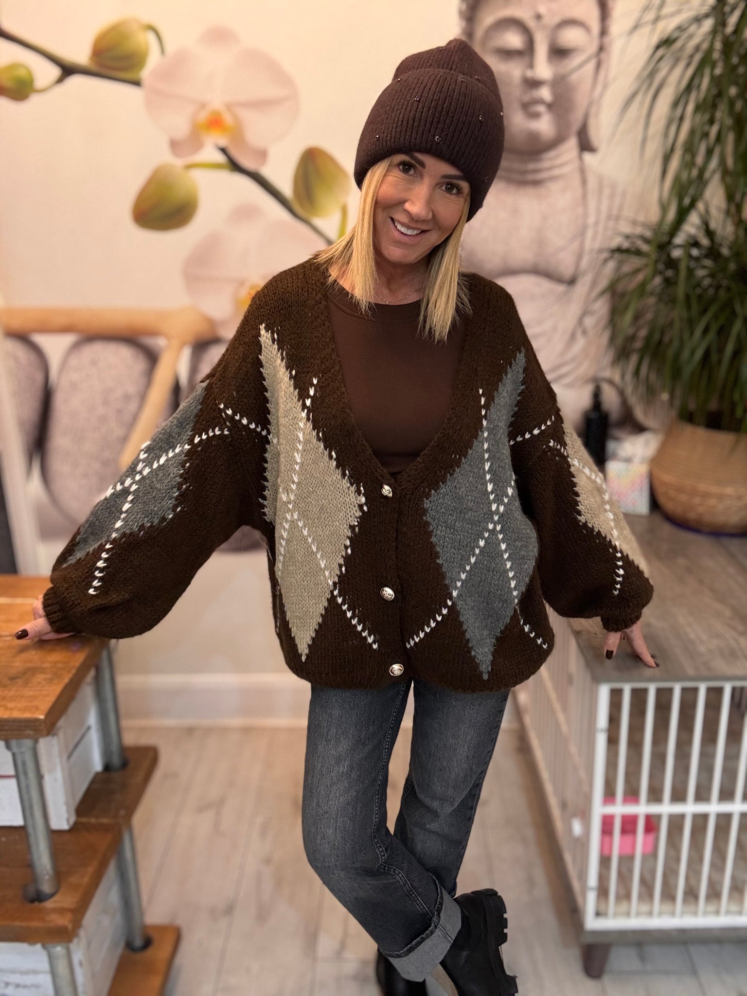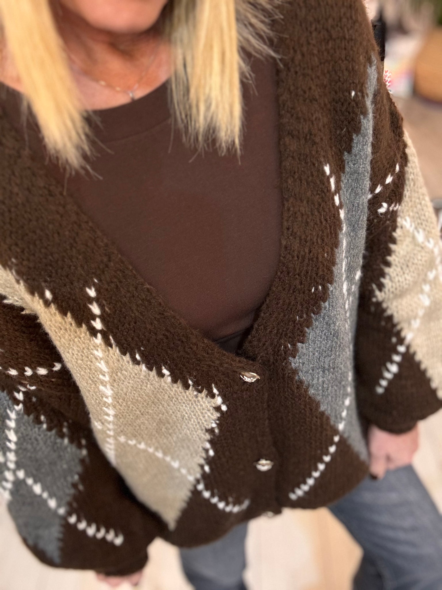Oversized cardigan with Argyle design and gold buttons one size will fit a 10 to 1810% Mohair 20% nylon 70% acrylic