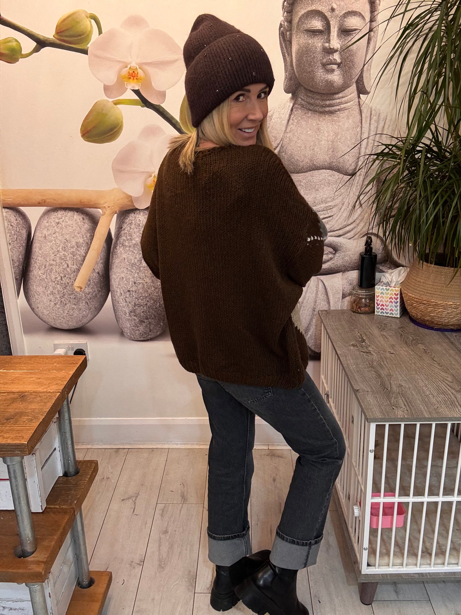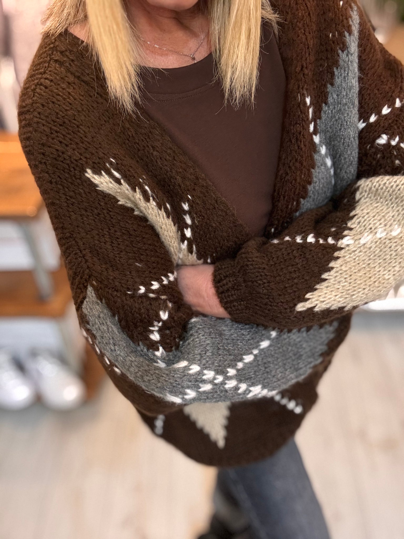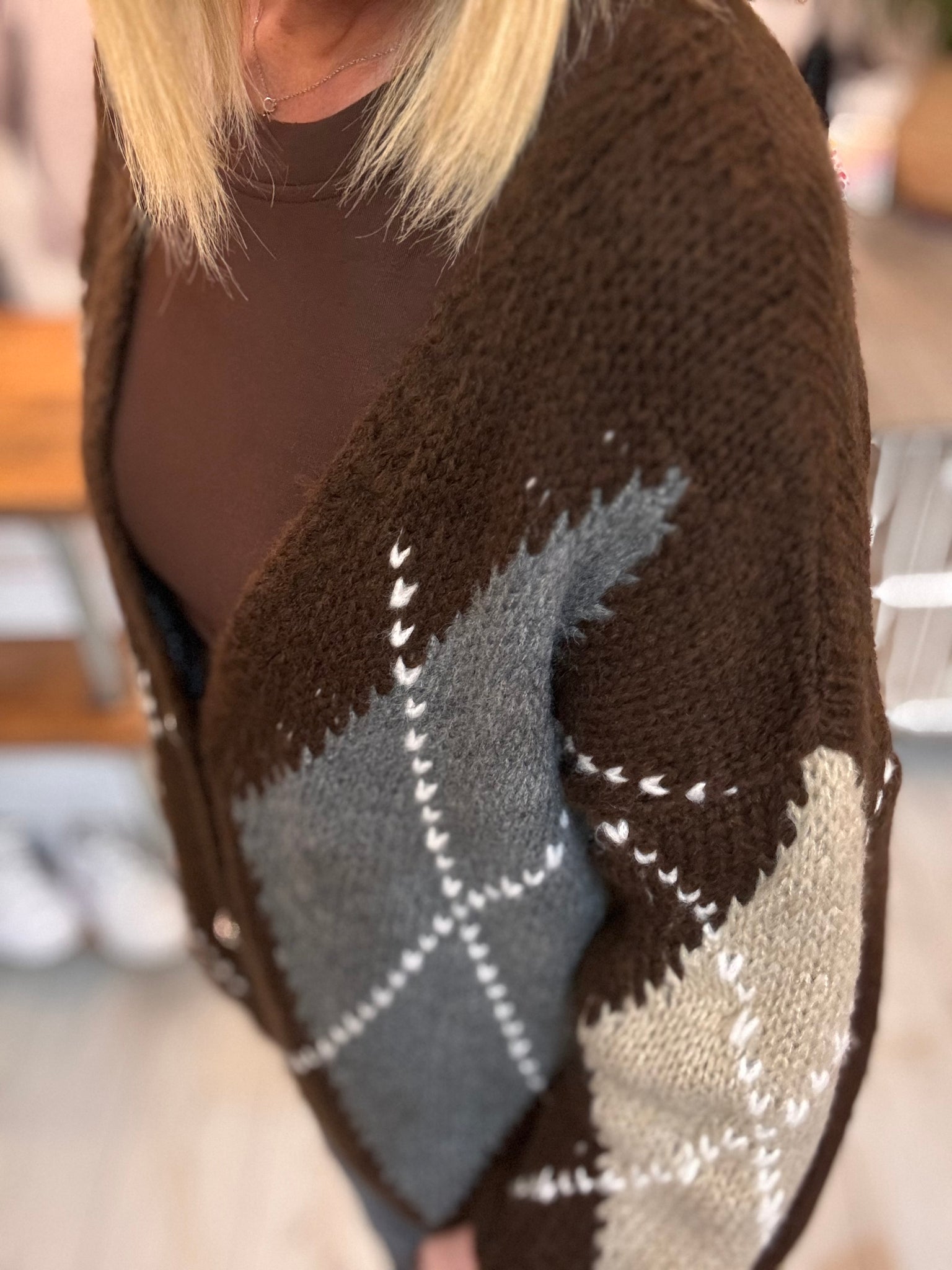 Oversized cardigan with Argyle design and gold buttons one size will fit a 10 to 1810% Mohair 20% nylon 70% acrylic