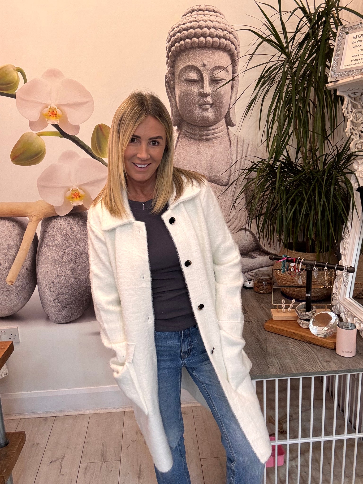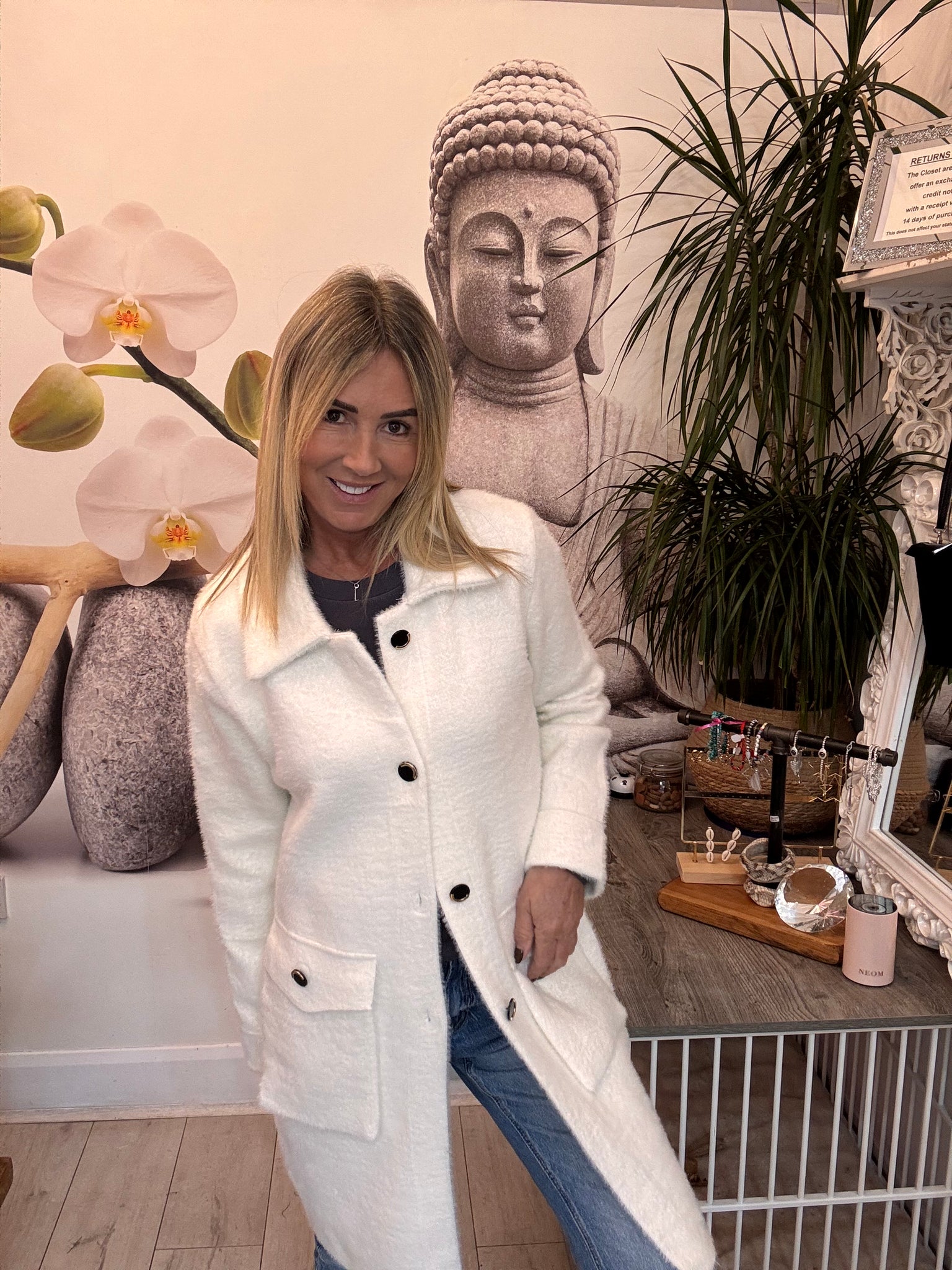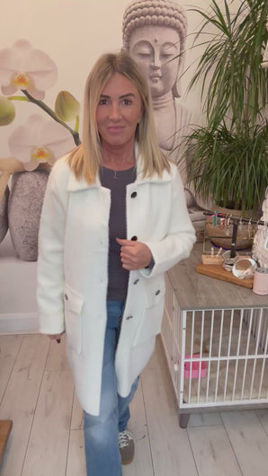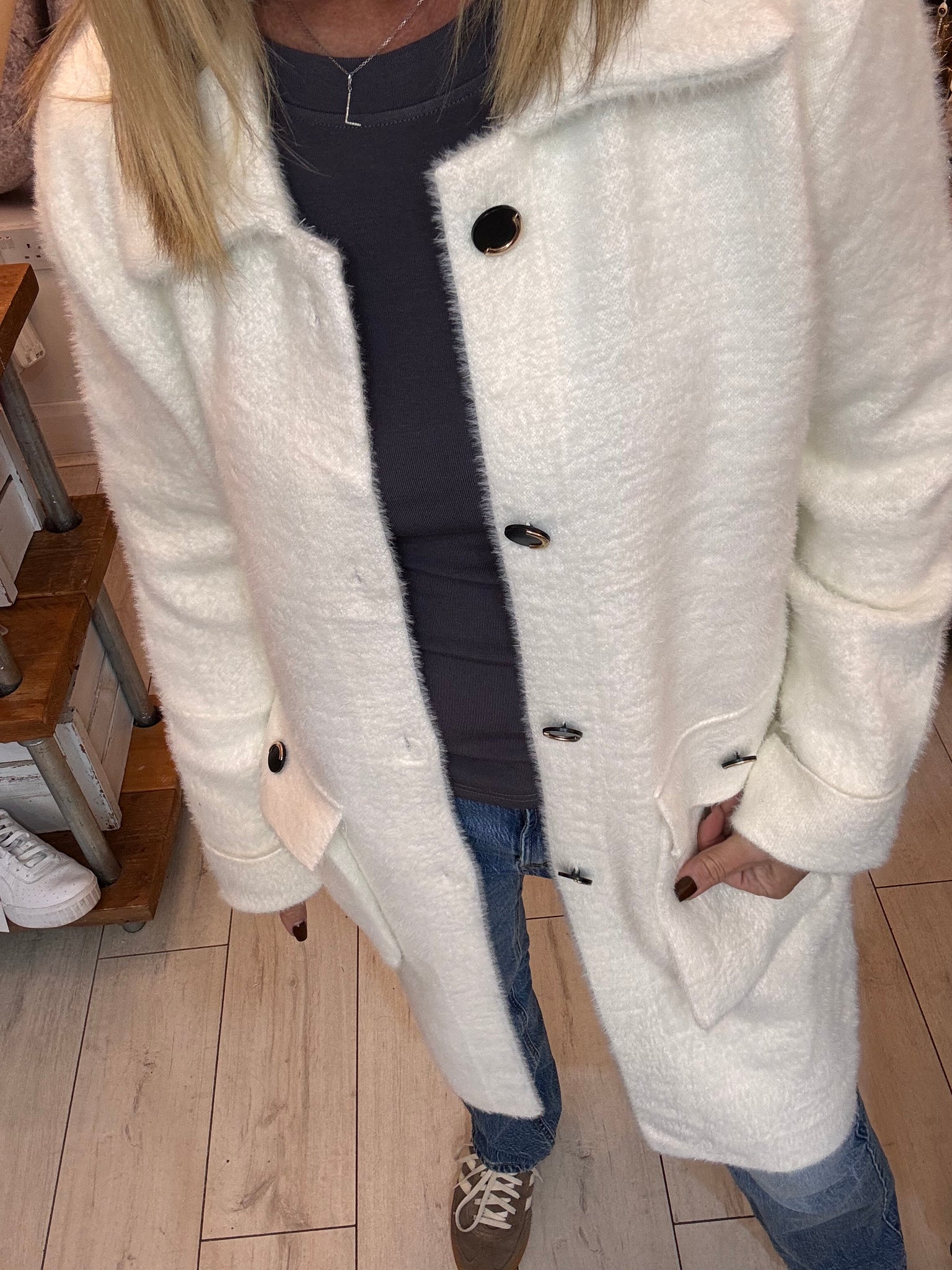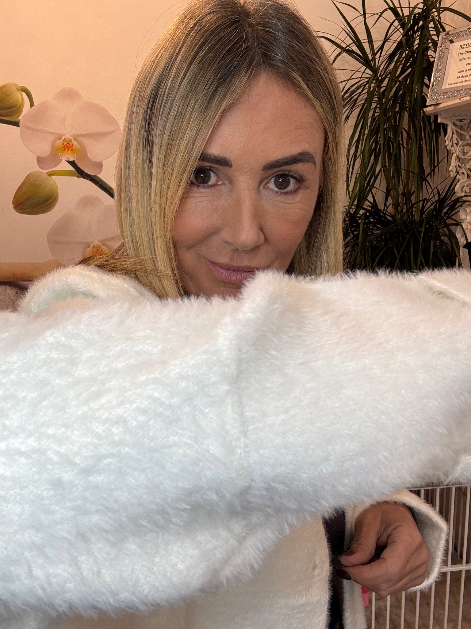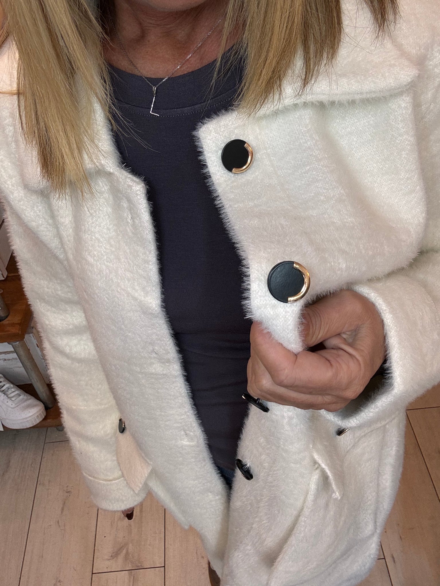 Fluffy 3/4 coat with gold trim buttons one size fits 10 to 14