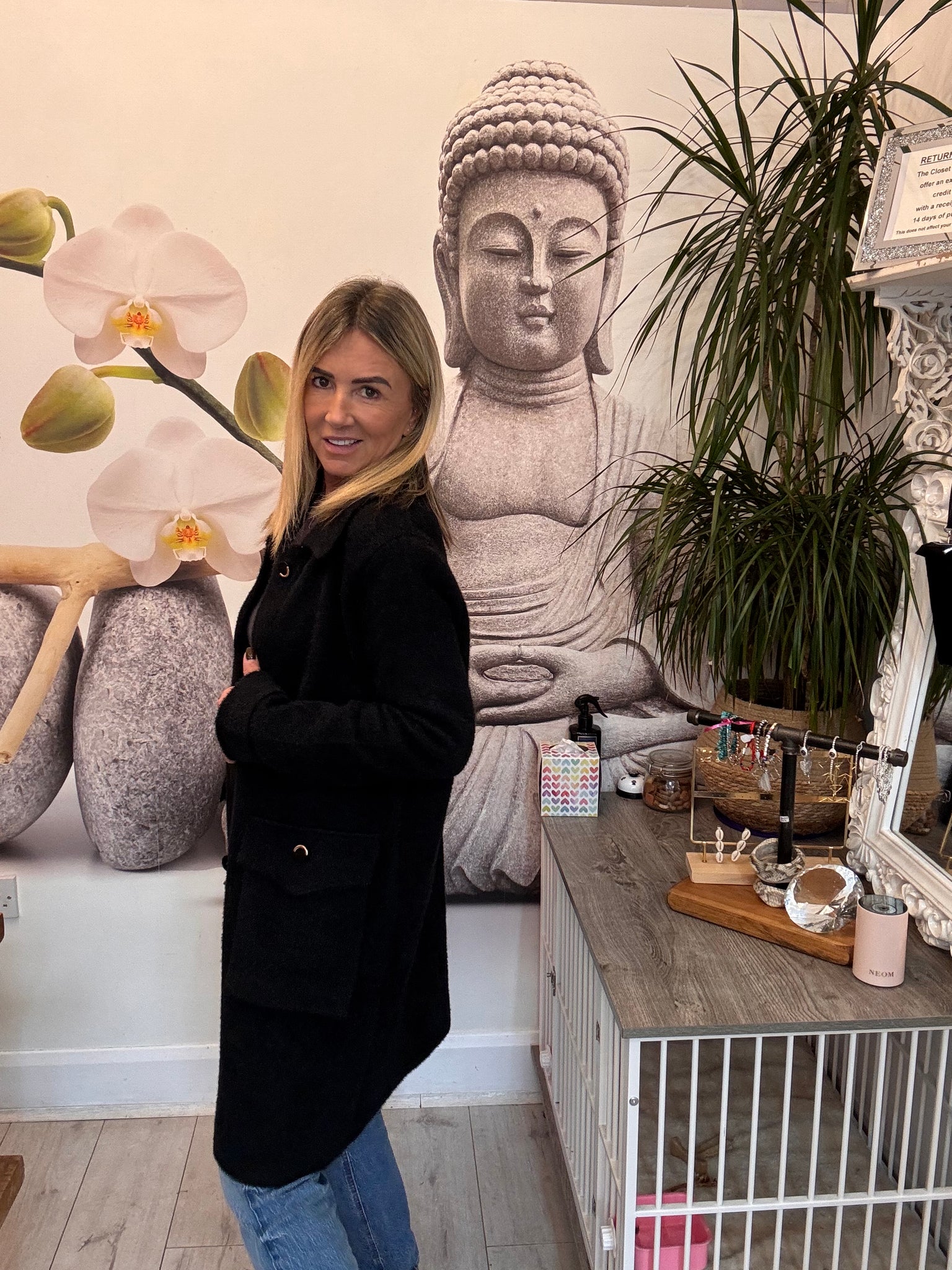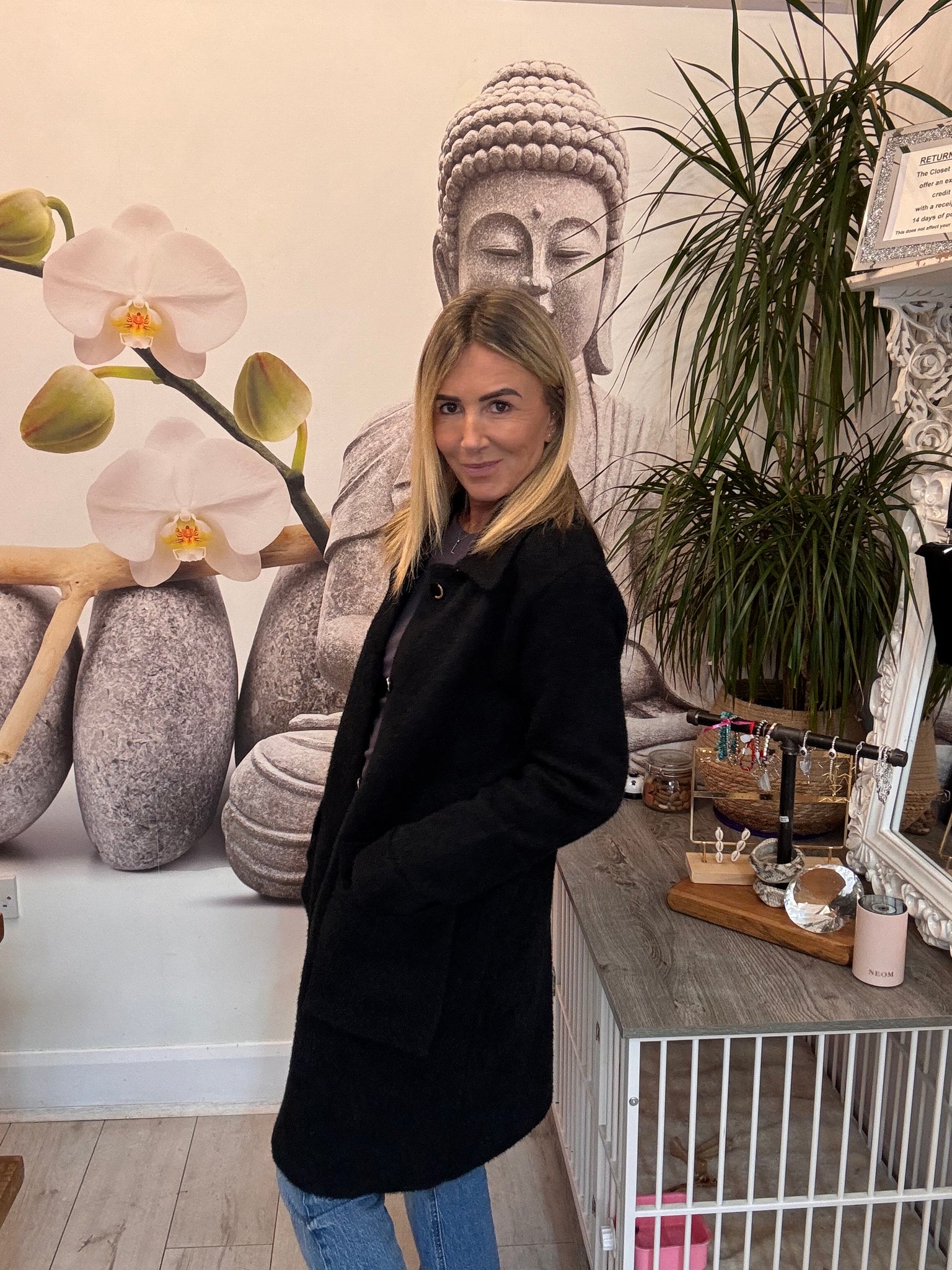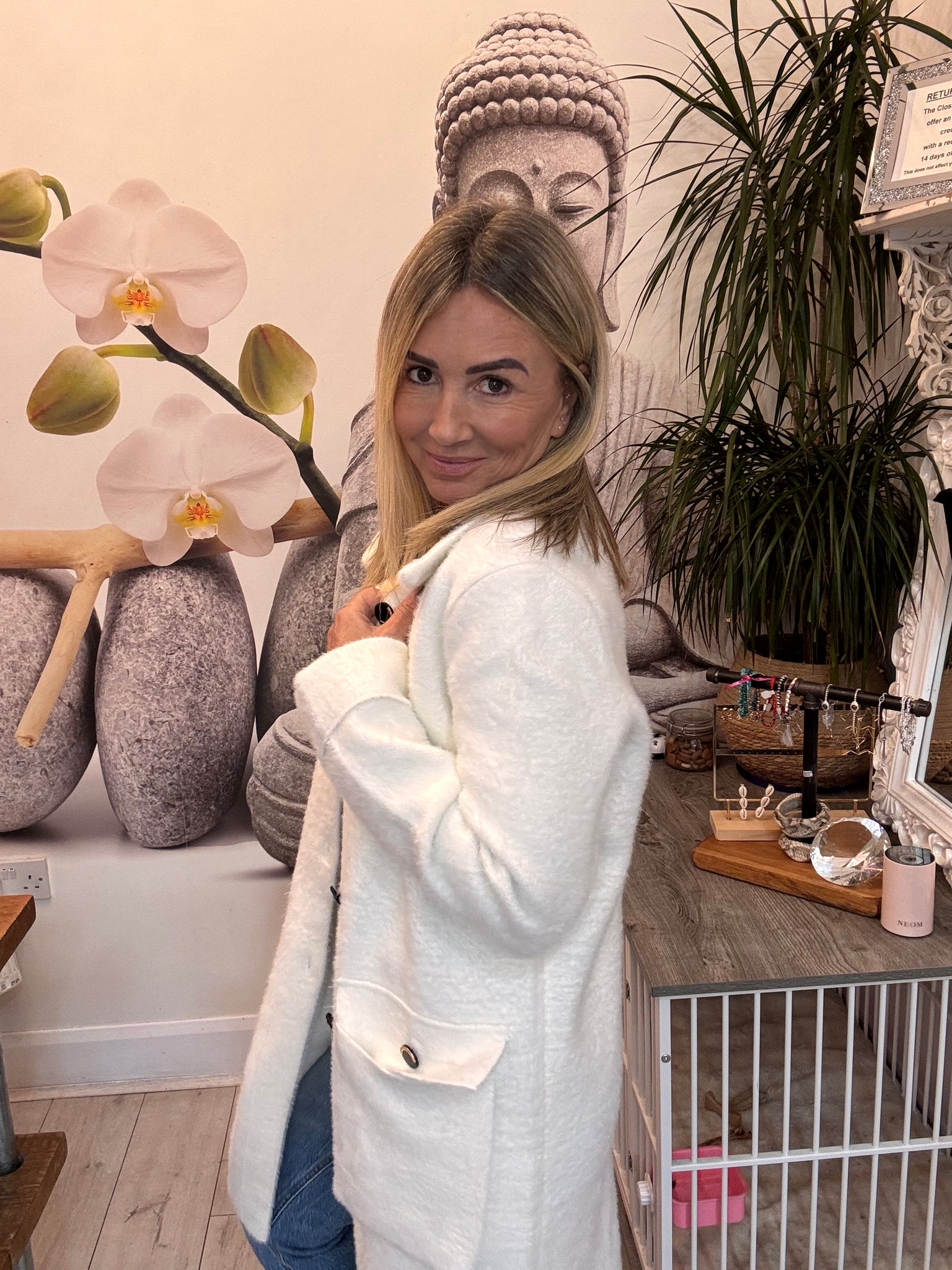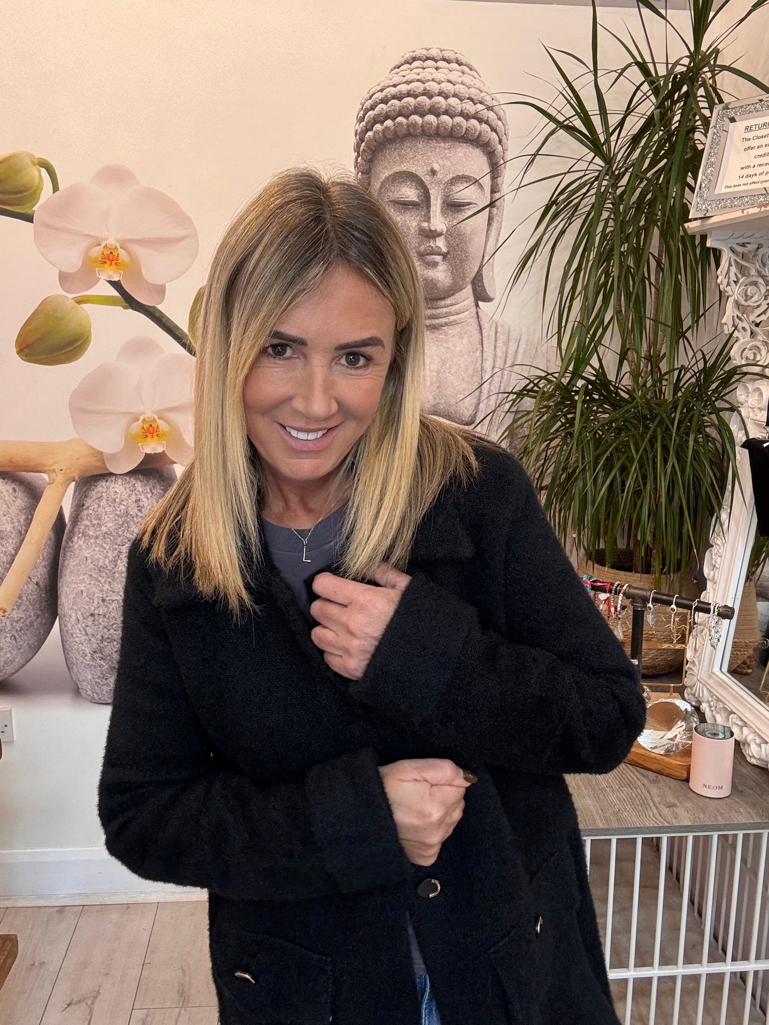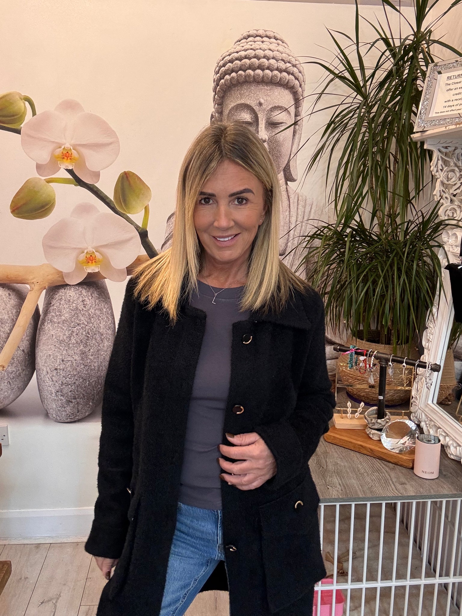 Fluffy 3/4 coat with gold trim buttons one size fits 10 to 14