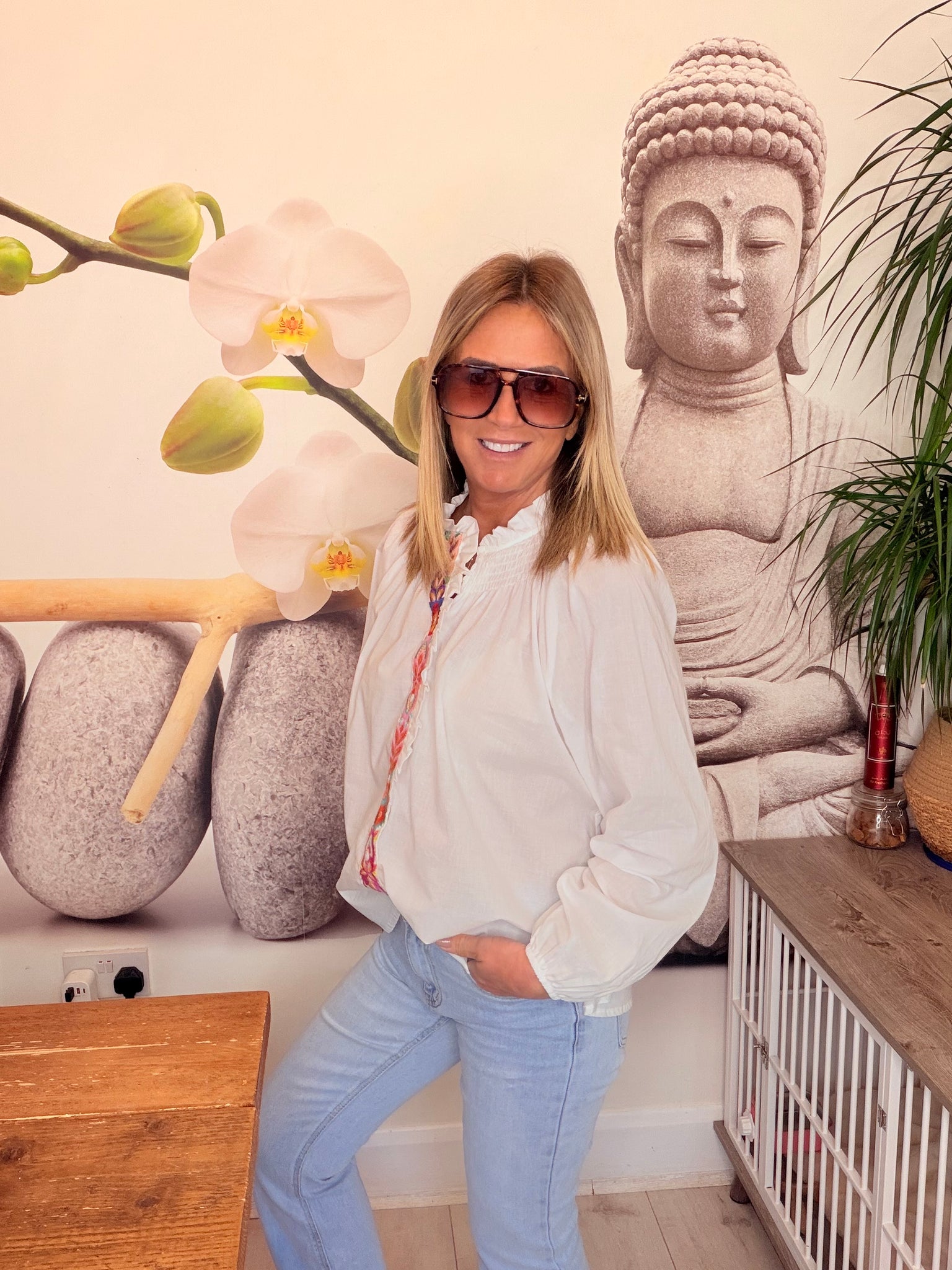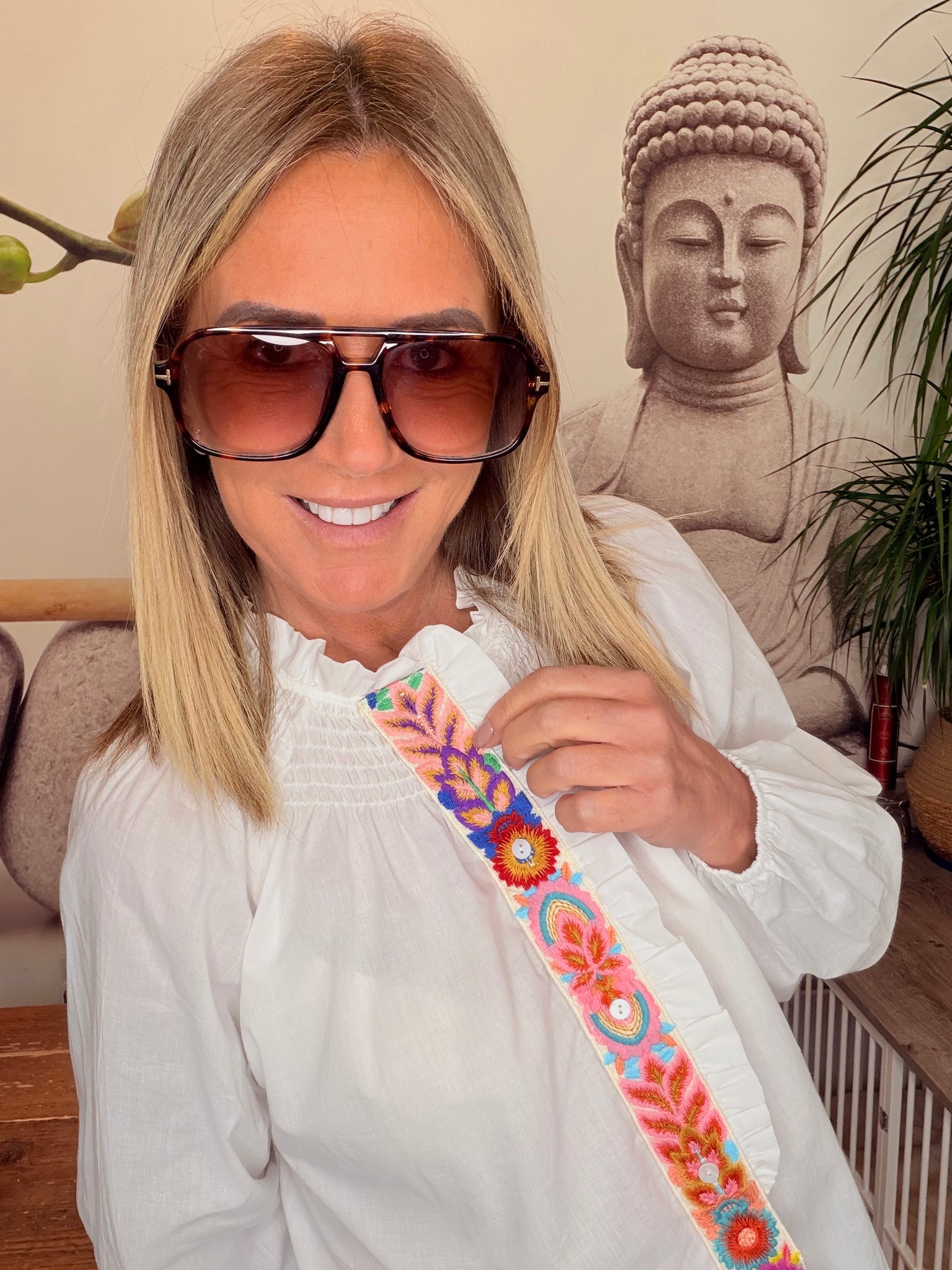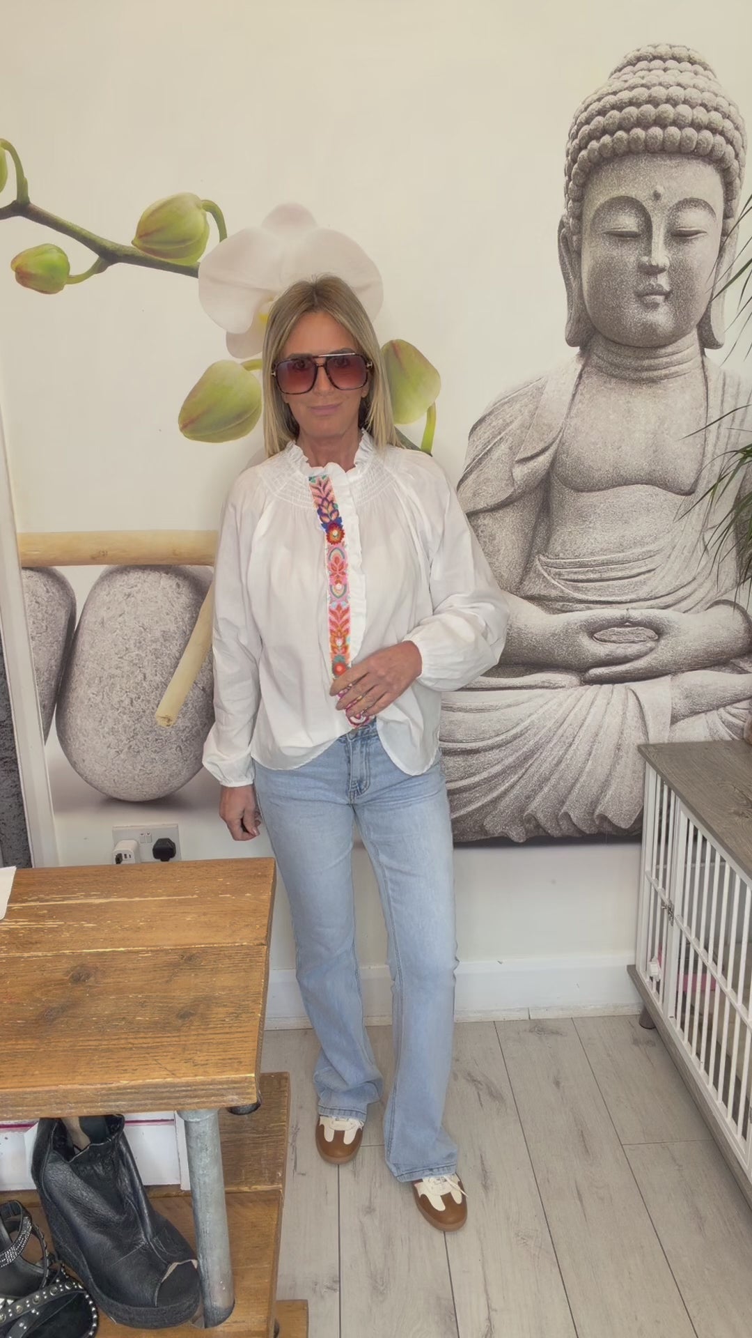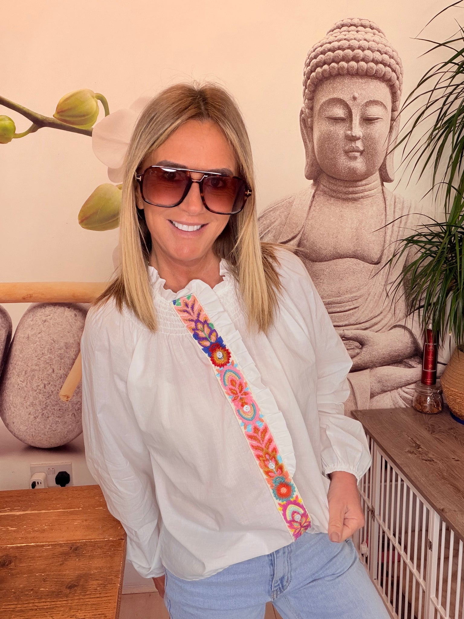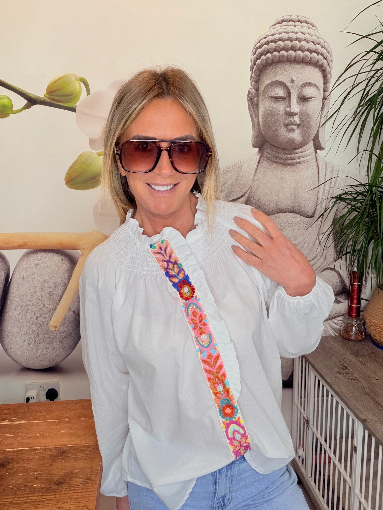 Embroidered front shirt with smocked neckline